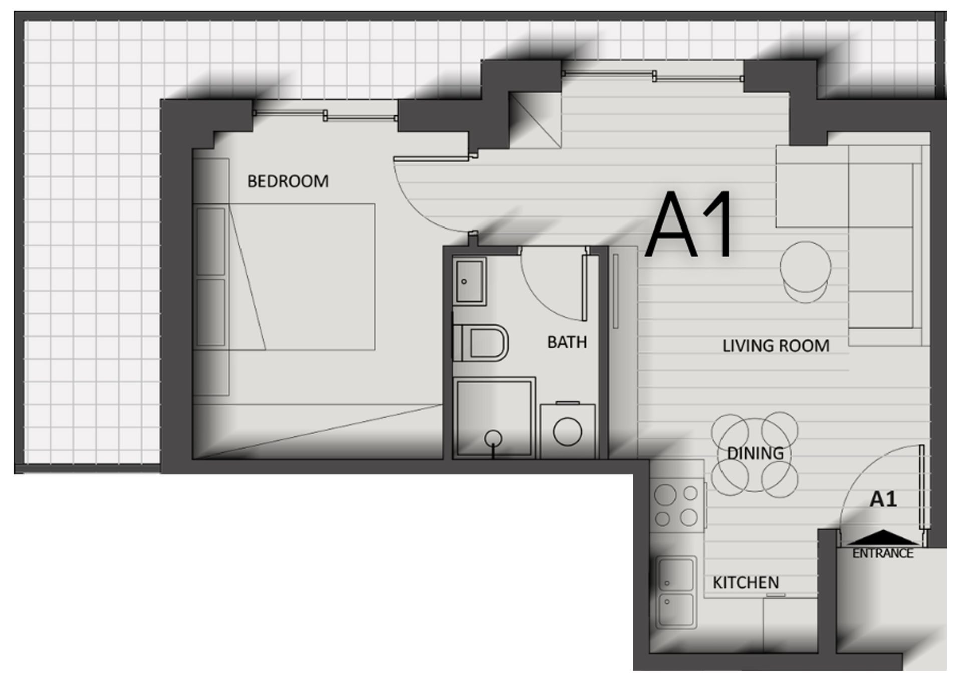 1 Bedroom – 1 Living Room – 1 Bathroom – Balcony Apartment (including 15 m² balcony)