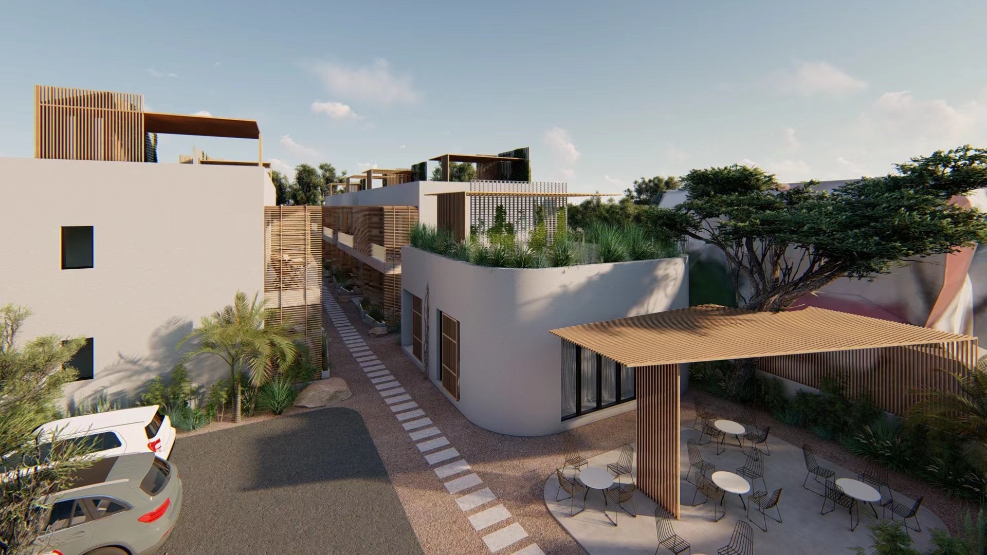 Projede bir Loby alanı, geniş bir yüzme havuzu, açık alanda hizmet veren bir restoran , bar açık büfe kahvaltı alanı, açık otopark ve peyzajlı güzel bahçeler mevcut.